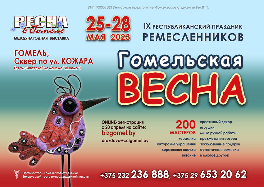 В рамках Выставки 25 — 28 мая пройдет IX Республиканский праздник мастеров и ремесленников «Гомельская Весна» (online регистрация), где мастера и ремесленники смогут представить свои работы.